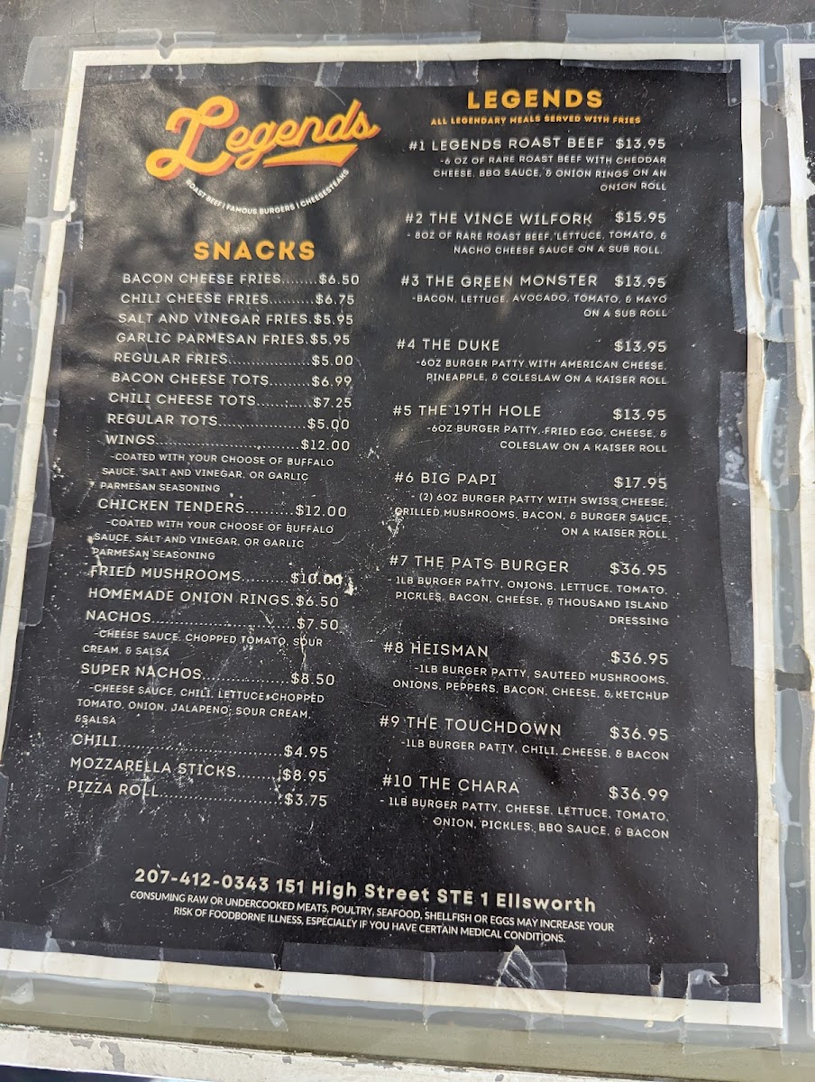 Welcome to Legends, where American comfort food takes center stage in Ellsworth, Maine. Located at 151 High St, this cozy eatery is a hidden gem renowned for its juicy burgers, especially the Soho and Oklahoma varieties that patrons rave about for their bold flavors and satisfying bites. Legends specializes in North Shore-style roast beef, a must-try for any meat lover, consistently receiving high praise for its quality and taste.
